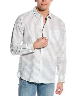 - Cabana Stripe Classic Fit Linen-Blend Shirt in shirting blue and off white with left chest pocket, barrel cuffs, box pleat at back, and shirttail hem