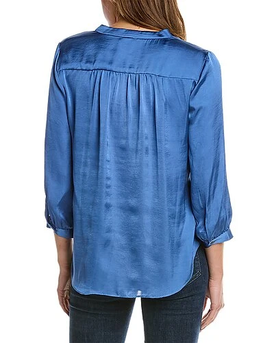 - 3/4-Sleeve Rumple Top in steel blue with V-neck, shirring details, 3/4-length sleeves with button cuffs and high-low hem
