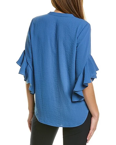 - Flutter Pintuck Blouse in steel blue with V-neck, 3/4-length sleeves, ruffle cascade cuffs, and layered high-low hem