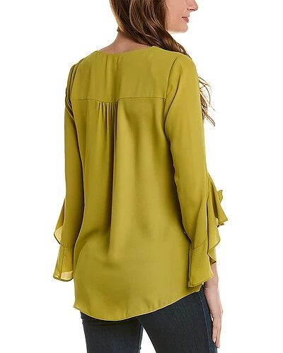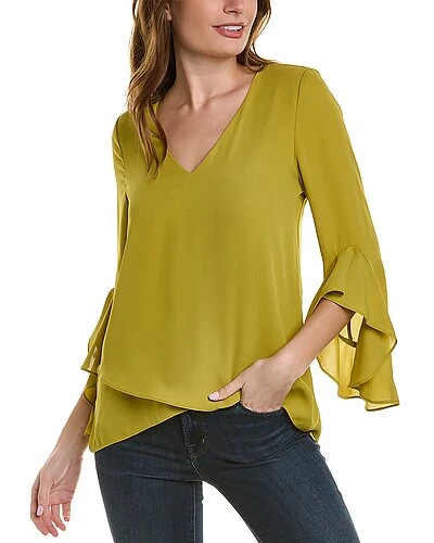 - Flutter Sleeve Tunic in avocado with V-neck, 3/4-length sleeves, ruffle cascade cuffs, and layered high-low hem
