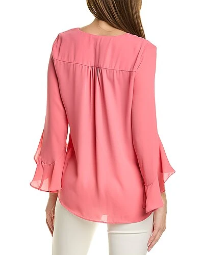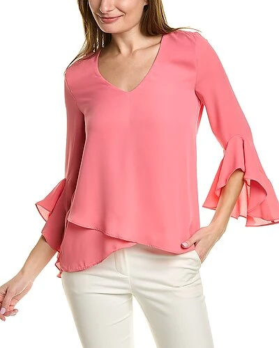 - Flutter Sleeve Tunic in carmine pink with V-neck, 3/4-length sleeves, ruffle cascade cuffs, and layered high-low hem