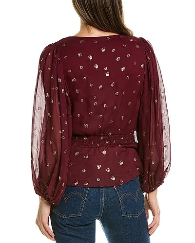- Foil Blouse in deep cranberry with V-neck, blouson sleeves, elasticized cuffs, and smocked waist