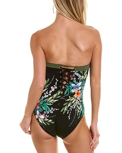 - Lace-Up Back Bandeau One-Piece in black with removable soft cups