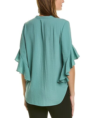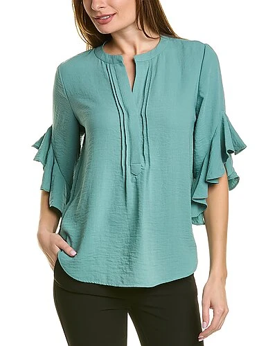 - Pintuck Rumple Blouse in teal lake with pintucked front, mock neck, 3/4-length sleeves, ruffle cascade cuffs, and high-low hem