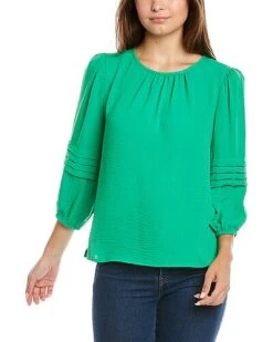 - Crinkle Blouse in vivid green with cinched 3/4-length sleeves, elasticized cuffs, and pleated details