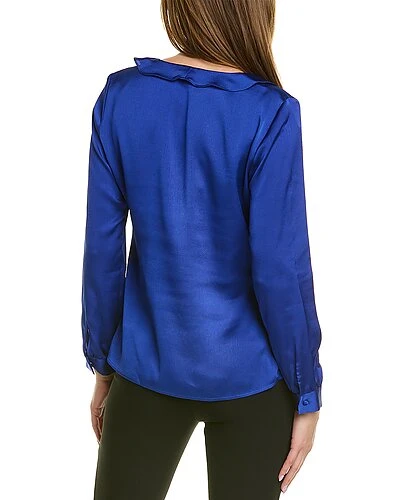 - Ruffle Front Blouse in deep celestial blue with hammered satin design and button cuffs