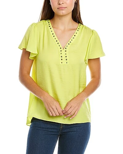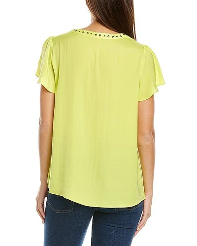 - Rumple Blouse in chartreuse with V-neck, studded trim, and flutter cuffs