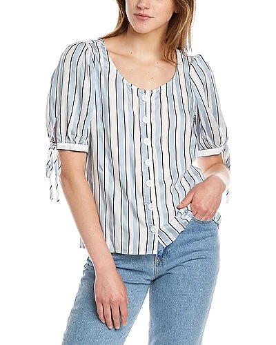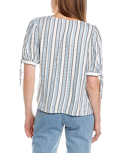 - Striped Blouse in canyon blue with elbow-length puff sleeves and tie cuffs