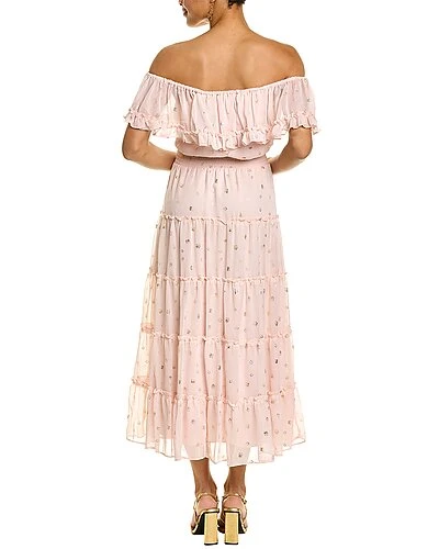 - Tiered Foil Maxi Dress in summer rose with off-the-shoulder design, elasticized neckline, smocked waist