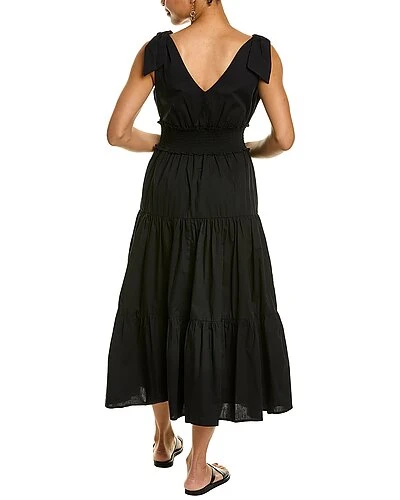 - Tiered Midi Dress in rich black with bow shoulders, smocked waist, and tiered shirring