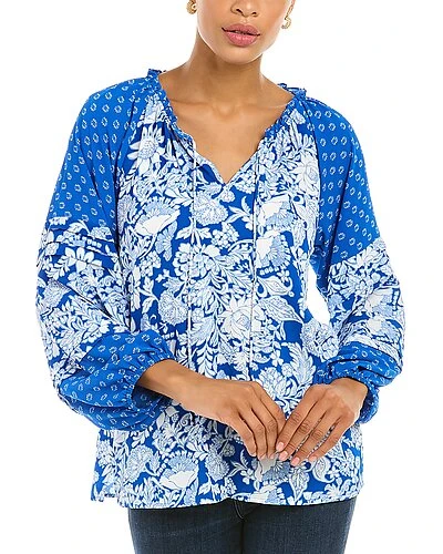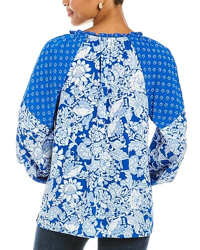 - Tropic Floral Peasant Blouse in Santorini blue with split neckline with self-tie closure, ruffle trim, elasticized cuffs and side slits at hem