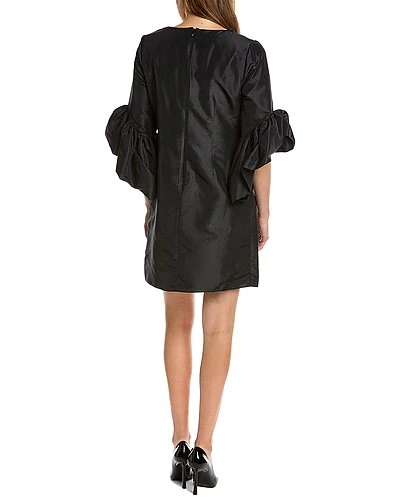 - Trumpet Sleeve Shift Dress in rich black with 3/4-length sleeves and cascade cuffs