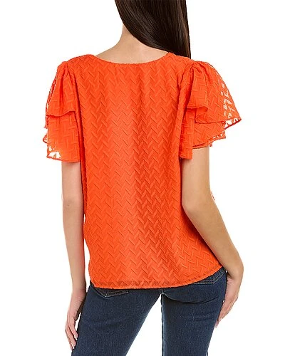 - Tulip Sleeve Top in blaze orange with textured design, V-neck, and layered tulip sleeve
