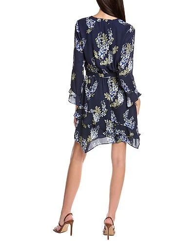 - Weeping Willows in night navy with V-neck, elasticized waist, ruffle cuffs, and ruffled tulip hem