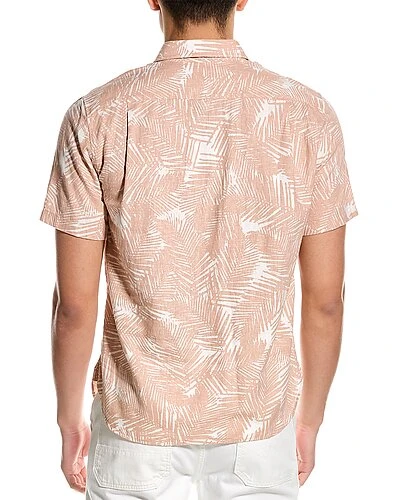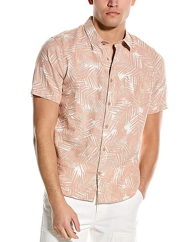 - Classic Fit Linen-Blend Shirt in dark rosewater palm print with left chest pocket, pleats at back, and shirttail hem