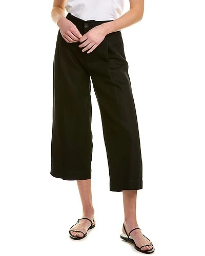 - Cropped Linen-Blend Casual Pant in black with belt loops, pleated front, and two back pockets