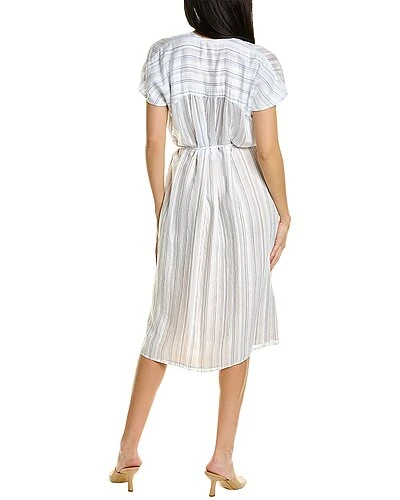 - Drapey Shirred Dress in off white & vista blue with dolman sleeves, keyhole neck with self-tie, dual side on-seam pockets, and drawcord waist