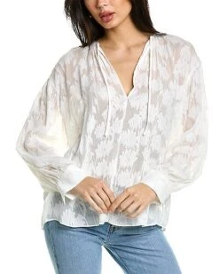 - Shirred Band Collar Silk Blouse in off white with jacquard design, button cuffs, dropped-shoulder sleeves, and shirred back