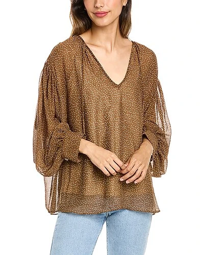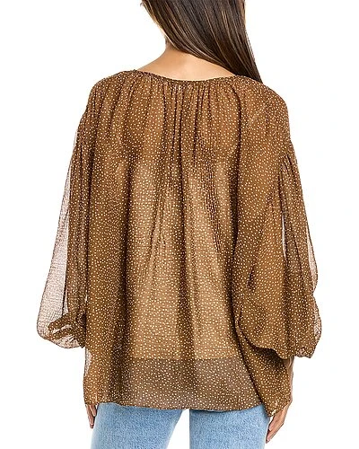 - Starry Dot Shirred Neck Blouse in Verona with sheer design, ruched neckline, dropped-shoulder dolman sleeves, and button cuffs