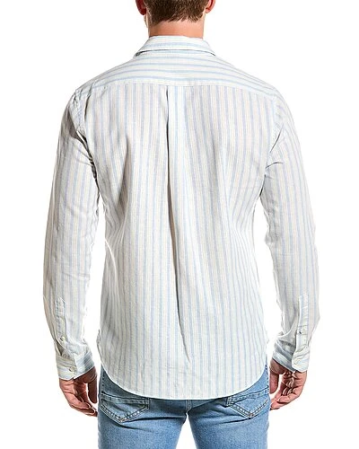 - Striped Classic Fit Linen-Blend Woven Shirt in blue and beige with left chest pocket, barrel cuffs, box pleat at back, and shirttail hem
