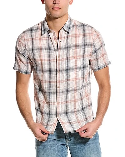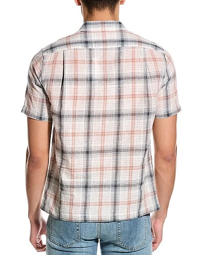 - Topanga Plaid Classic Fit Linen-Blend Shirt in off white and Himalayan salt with left chest pocket and pleats at back