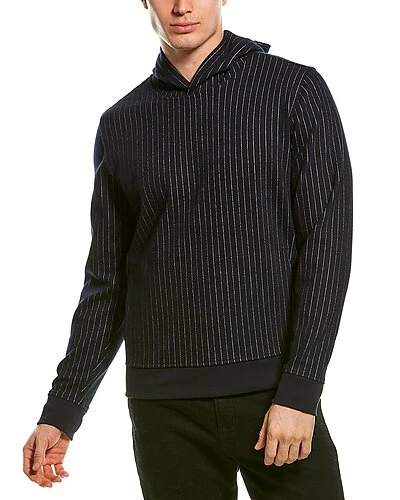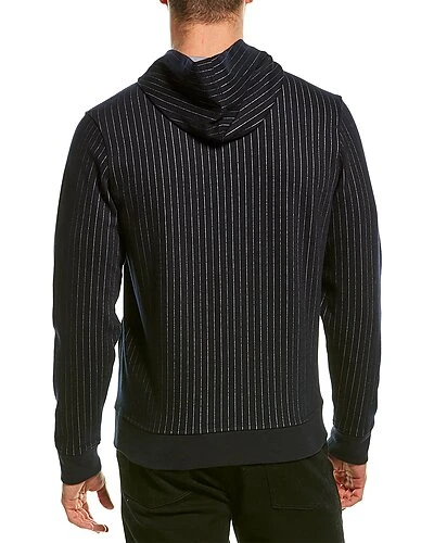 - Vertical Stripe Wool-Blend Hoodie in coastal & medium heather grey with drawstring hood and kangaroo pocket